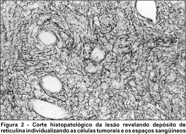 O exame anátomo-patológico da massa evidenciou proliferação de células fusiformes agrupadas em feixes e intercaladas por múltiplos e pequenos canais vasculares, revestidos por células endoteliais aplanadas. A lesão apresentava leve grau de pleomorfismo e de atipia celular. Não foram observadas invasão de vasos sangüíneos, necrose ou hemorragia intra-tumoral. Havia cerca de 5 mitoses/10 campos de 400X. Para a análise imunohistoquímica, foram utilizados os marcadores vimentina, antígeno comum leucocitário (LCA), citoceratinas (AE1 e AE3), proteína filamentar S100, fator VIII, actina muscular (HHF35) e reticulina. O material mostrou-se positivo apenas para a vimentina e reticulina, sendo que a reticulina revelou uma trama espessa individualizando as células e espaços vasculares, o que praticamente selou o diagnóstico de hemangiopericitoma (Figura 2).
