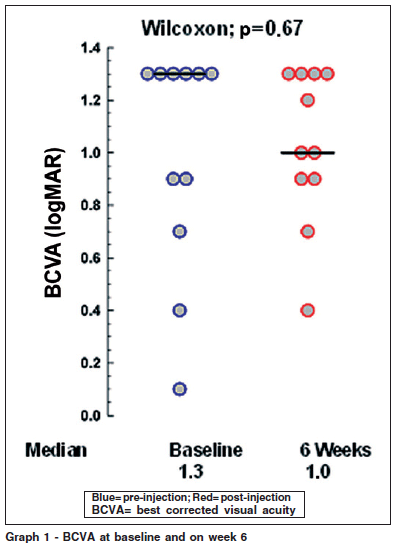 The best corrected visual acuities at baseline ranged from 20/25 to 6/120 (0.1 to 1.3 logMAR), the mean was 0.982 logMAR (± 0.4262). On week 6 they ranged from 20/50 to 6/120 (0.4 to 1.4 logMAR), the mean was 1.027 logMAR (± 0.2936). On Wilcoxon signed ranks test there was no correlation between the results with a p=0.67 (Graph 1).