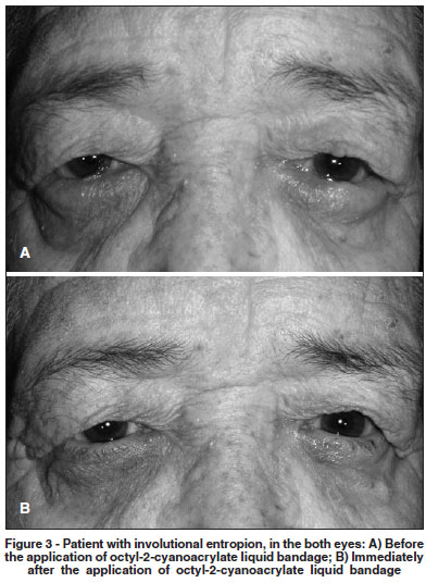Involutional entropion affects elderly patients preferentially, who often experience many medical and social problems(9). Therefore, until these patients are clinically stabilized such that they are able to undergo a surgical procedure, the application of octyl-2-cyanoacrylate liquid bandage offers temporary correction of eyelid position and relief of symptoms.