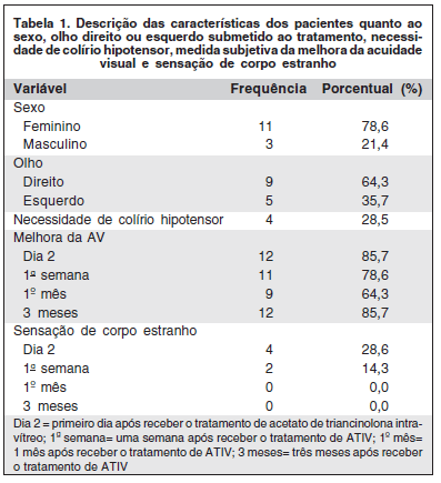 A principal complicação observada foi HIO, sendo o maior pico pressórico de 28 mmHg. Quatro pacientes (28,57%) apresentaram PIO maior que 21 mmHg, na primeira semana após a injeção de ATIV. Todos receberam colírio hipotensor (maleato de timolol 0,5%, uma gota de 12 em 12 horas) até o primeiro mês após o procedimento, com retorno pressórico inferior a 21 mmHg, quando então foi retirado o medicamento. Nenhum dos pacientes foi submetido à cirurgia filtrante.