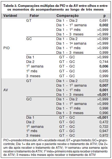 A PIO média no grupo tratado foi superior na primeira semana com relação ao dia 1 (p=0,002) e também é superior ao grupo-controle na primeira semana (p=0,006). Assim, ao compararmos as médias da PIO do grupo tratado ao longo do estudo com a PIO inicial, observa-se uma diferença significativa somente na primeira semana após o tratamento. Quando se comparou a PIO do grupo tratado com a do grupo-controle, houve diferença somente na primeira semana após o tratamento. Para o restante dos momentos, em que foram feitas as aferições não se observou diferença (Tabela 3).