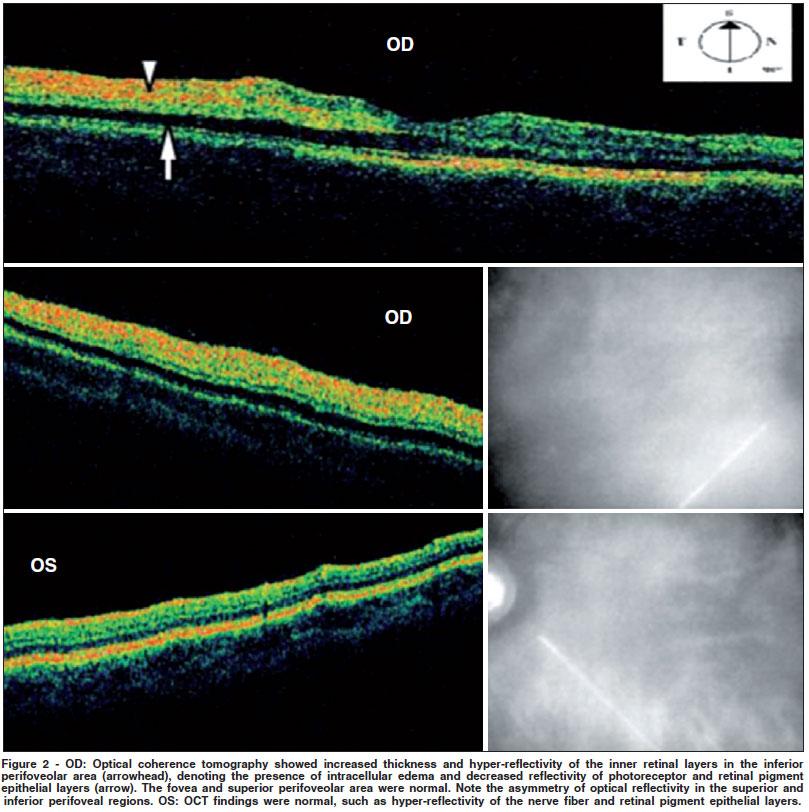 In the acute phase, the patient underwent scanning by the optical coherence tomography (Stratus OCTTM, Model 3000, Version 4.0.1, Carl Zeiss Ophthalmic System Inc. Humphrey Division. Dublin, CA, USA), using the line scan protocol (6.0 mm) in the macular area and in the inferior branch retinal artery area. OCT revealed increased thickness and hyper-reflectivity of the inner retinal layers in the inferior perifoveolar area, denoting the presence of intracellular edema, with decreased reflectivity of photoreceptor and retinal pigment epithelial layers. The asymmetry of optical reflectivity in perifoveal region was an important finding (Figure 2). OCT findings in the fovea and superior perifoveolar area in the right eye and fundus in the fellow eye were normal.