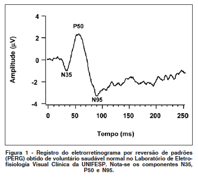 O PERG pode apresentar dois tipos de traçados diferentes dependendo da frequência temporal apresentada na estimulação (uma resposta completa antes da próxima reversão do contraste), sendo chamado de "transiente" quando a taxa de reversão temporal dos padrões é de até 6 ciclos por segundo e de estado estável acima de 6 ciclos por segundo(12). O PERG transiente em indivíduos normais consiste em uma onda de baixo sinal composta por três elementos assim distribuídos (Figura 1): um pequeno pico negativo inicial (N35) seguido de um componente positivo maior ao redor de 45-60 ms (P50), que por sua vez é seguido de um componente negativo ao redor de 90-100 ms (N95). A nomenclatura utilizada é baseada nas normas práticas da clínica neurofisiológica pelas quais os componentes são identificados pela polaridade e latência aproximada(4,12-13). Em muitos indivíduos o vale N35 não é definido, sendo substituído pela média entre o tempo zero e P50(2-3,9). A sua origem ainda não está estabelecida(1,4,9).