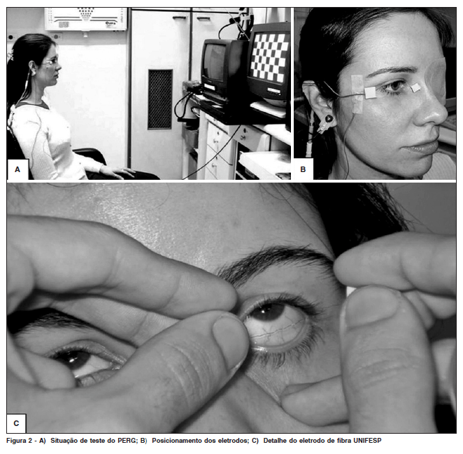 O registro do PERG foi realizado em sala escura em condição monocular de estimulação, com o primeiro olho escolhido aleatoriamente, com pupila natural para preservar a acomodação e manter a qualidade da imagem retiniana e quando necessário a correção óptica adequada. Cada participante, durante o exame, permaneceu confortavelmente sentado, com um monitor de vídeo de alta resolução com luminância constante ao nível dos olhos no qual foram gerados os padrões, posicionado à distância de 1 metro. Foi solicitada fixação no centro da tela do monitor e durante a realização monitorava-se constantemente a fixação, a condição de alerta e o piscar do indivíduo.