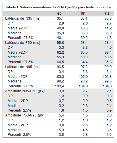 A recomendação feita pela ISCEV de padronização dos valores de normalidade e também da forma de realização do exame de eletrorretinograma por reversão de padrões é de grande importância na prática diária de um laboratório de eletrofisiologia visual(12-13). Dados normativos obtidos em outro laboratório por vários motivos não podem ser utilizados como parâmetros de normalidade já que raramente os laboratórios de eletrofisiologia usam exatamente o mesmo equipamento para aquisição das respostas, havendo configurações, marcas e modelos diferentes(18). Ocorrem também diferenças nos eletrodos utilizados(14), bem como diferenças raciais da amostra estudada e também da experiência da equipe em realizar o exame justificando assim necessidade de dados normativos próprios tanto para o PERG como para outros exames eletrofisiológicos(21-26).