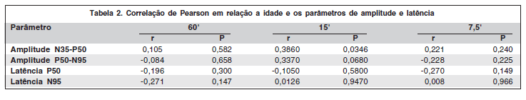 Os resultados da correlação de Pearson para amplitude e latência do PERG para os três estímulos apresentados em relação a idade são mostrados na tabela 2. Não houve correlação entre nenhum dos parâmetros estudados e a idade dos participantes, exceto fraca correlação positiva entre amplitude P50 para o estimulo de 15 minutos de arco (r=0,39; P=0,035).