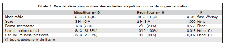 Comparando-se as características das esclerites idiopáticas com as de fundo reumatológico observaram-se os dados da tabela 2.