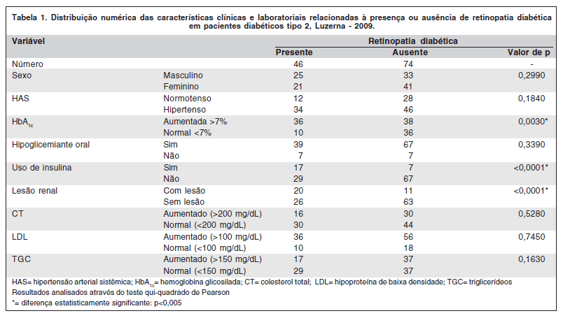 Não foi encontrada significância estatística ao relacionar-se hipertensão arterial com retinopatia diabética uma vez que no momento da coleta dos dados 73% dos pacientes com retinopatia diabética e 62% dos pacientes sem retinopatia apresentaram níveis pressóricos elevados. Em concordância com o presente trabalho, dois estudos brasileiros recém realizados, respectivamente no Rio Grande do Sul(19) e Rio Grande do Norte(20), avaliaram fatores de risco relacionados ao diabetes e concluíram que a hipertensão arterial não pareceu constituir fator agravante da retinopatia diabética. No entanto, a Sociedade Brasileira de Diabetes considera o controle da hipertensão arterial uma medida importante para evitar complicações secundárias como a RD(21).