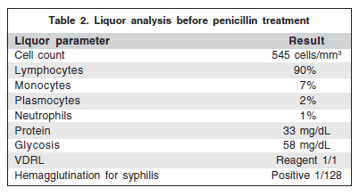 The patient was readmitted and treated with intravenous crystalline penicillin, 18 million units per day, with rapid improvement of fundoscopic aspect of the right eye and negativation of liquor VDRL after 14 days, but maintained vision loss.