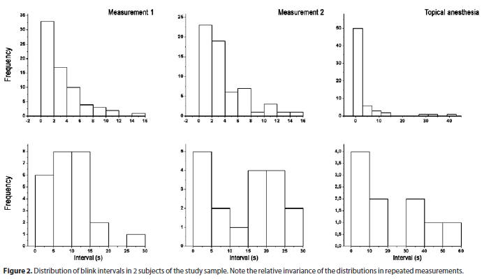 OBJETIVOS: Determinar se a distribuição dos intervalos do piscar espontâneo se mantém em medidas repetidas com e sem anesthesia tópica ocular.