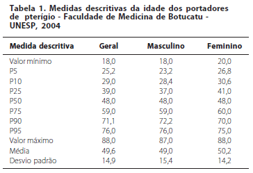 A média de idade dos portadores de pterígio foi de 49,6 ± 14,9 anos. Nas mulheres a média de idade foi de 50,2 ± 14,2 anos e nos homens de 49,0 ± 15,4 anos (Tabela 1).