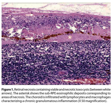 Pathological diagnosis of ocular toxoplasmosis can be established by chorioretinal biopsies or diagnostic enucleation(3,26). The toxoplasma cysts are identified with haematoxylin and eosin, immunohistochemistry using polyclonal or monoclonal antibodies(3,27), or by PCR(17). Histologically, ocular toxoplasmosis often presents extensive granulomatous inflammatory infiltration of the choroid and areas of necrosis under the retinal pigment epithelium(3,26). Furthermore, the parasite's DNA can be identified in vitreous and humour samples using PCR(21,28). Serum levels of chemokines (CXCL8) can also be used, mainly during follow-up(29).