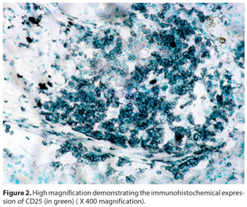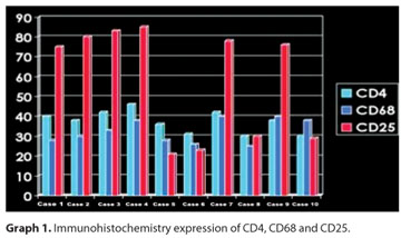 Regarding immunohistochemical profiling (Graph 1), CD25 was positive (Figure 2) in all (4) IgM positive cases, but only in two out of the six IgM negative patients. No differential expression was seen for CD4 (Figure 3) and CD68.