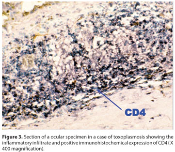 RESULTADOS: A avaliação histopatológica não mostrou diferenças entre os casos de toxoplasmose ocular com relação às características avaliadas mencionadas anteriormente. Entretanto, CD25 revelou maior expressão de interleucina-2 nos 4 casos adquiridos comparado com os demais.