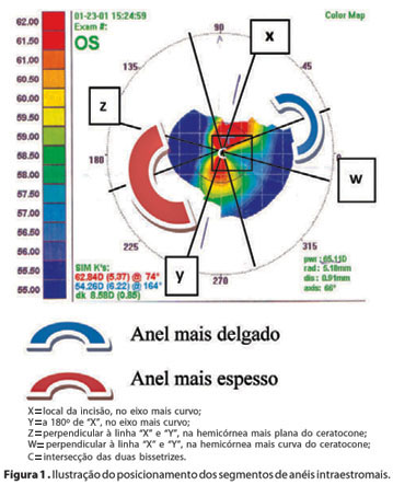 O posicionamento dos anéis seguiu um nomograma estabelecido para este estudo (Quadro 1), que consistiu na divisão da superfície corneana em 5 pontos, sendo X, Y, W, Z e C. O ponto X sendo o local da incisão (superior), no eixo mais curvo; o ponto Y a 180º de "X", também no eixo mais curvo; o ponto W perpendicular à linha "X" e "Y", na hemicórnea compreendendo a área mais curva do ceratocone e o ponto Z perpendicular à linha "X" e "Y", na hemicórnea compreendendo a área mais plana do ceratocone. O ponto C equivalendo à região central do mapa topográfico (Figura 1).