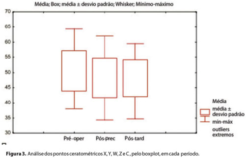 Na comparação do ponto W, o pré-operatório variou de 40,69 D a 64,35 D, sendo o valor médio obtido de (x 51,69 ± 7,76), no período pós-precoce temos os valores variando de 48,80 D a 55,82 D (x 52,14 ± 2,84) e no pós-tardio com 49,00 D a 55,17 D (x 52,02 ± 2,36), sem diferença estatisticamente significante.