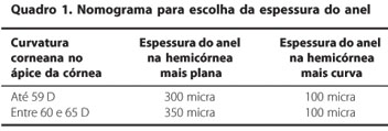 Na hemicórnea mais plana, ponto Z, foi posicionado o anel mais espesso. Baseando-se na curvatura do ápice da córnea, até 59 D anel de 300 micra e entre 60 e 65 D anel de 350 micra (Figura 1).