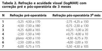 Quando fazemos a comparação da AV sem correção, no pré-operatório com o pós-operatório de 1 mês, houve melhora em 5 olhos (71,4% ) e 2 olhos (28,6%) mantiveram a mesma visão. Houve melhora da AV de um paciente entre o pós-operatório de 1 mês e 3 meses, por isso quando fazemos a comparação do pré-operatório com o pós-operatório de 3 meses evidenciamos uma melhora em 6 olhos (85,7%) obtiveram melhora visual.