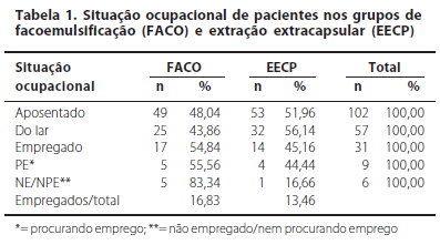 Foram submetidos a cirurgia de catarata 205 pacientes, destes, 101 pela técnica de FACO e 104 pela técnica de EECP. A média de idade no grupo da FACO foi de 68,3 anos ± 9 anos e de 69,1 anos ± 8,5 anos no grupo da EECP (p=0,70). Quanto ao sexo, 35,3% e 44,1% dos pacientes eram do sexo masculino no grupo da FACO e EECP, respectivamente (p=0,40). A tabela 1 apresenta a distribuição ocupacional, por tipo de cirurgia. A porcentagem de pacientes empregados no grupo FACO foi de 16,83%, e no grupo EECP de 13,46%.
