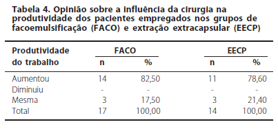 A maior proporção dos indivíduos analisados não exercia atividade profissional remunerada, 83,17% no grupo FACO e 86,54% no grupo EECP (Tabela 1), proporção semelhante à constatada por outros estudos(13-14). Estes pacientes relatavam que a atual situação de desemprego era influenciada pela dificuldade visual (Tabela 2). Após a realização da cirurgia, a maioria dos indivíduos não empregados, em ambos os grupos, declarou-se motivada a procurar trabalho, devido à melhora da condição visual (Tabela 3), resultado semelhante a outro estudo nacional(12).