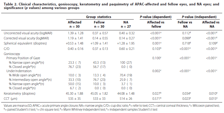 However, our knowledge about the pathophysiology of the angle closure is still incomplete. So, we decided to perform a clinical and biometric comparison among eyes that have an anatomic feature in common (narrow angle), eyes with the diagnosis of primary open-angle glaucoma (POAG) with narrow angle (NA), affected and fellow eyes of patients with APAC.