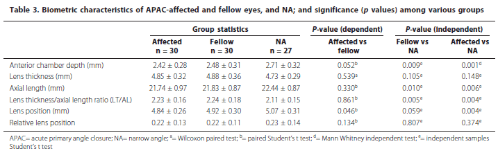 Methods: Comparative case series; 30 patients with APAC and 27 glaucomatous patients with NA were evaluated. Keratometry (K), central corneal thickness (CCT), lens thickness (LT), axial length (AL) and anterior chamber depth (ACD) were measured. Parameters defined as lens posisiton (LP) and relative lens position (RLP) were calculated.