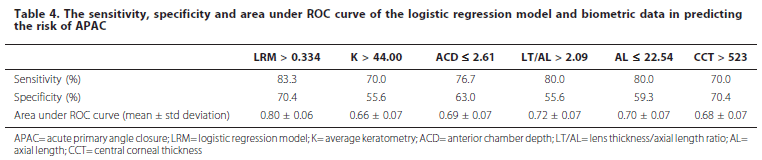 It is known that the APAC fellow eyes should be treated with LPI in order to avoid an acute crisis of angle-closure(27-28), nevertheless, this treatment is not free of complications and side effects. Several provocative tests have been employed to try to identify patients at risk of developing acute angle-closure glaucoma, but most of them are either not very sensitive(29-30) or time-consuming, and thus not suitable as screening procedures in general practice. Some authors suggested that an increase of a single parameter (LT/AL) is correlated with a decrease in duration in time to the need for LPI(30). Therefore, we decided to use three parameters (K, CCT and LT/AL) to build a logistic regression model, with the aim to predict the risk of APAC in the fellow eye, and as a result, try to identify the eyes with narrow angle which we should perform LPI treatment. The logistic regression model with values above 0.334 can distinguish an APAC fellow eye from a NA eye with 83.3% of sensitivity and 70.4% of specificity, and could be at least a reasonable indicator for prophylactic LPI among the eyes evaluated in this study (Table 4). As a matter of fact, more studies are necessary to validate and improve the efficacy of this logistic regression model.