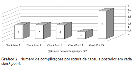 Do total de 84 olhos operados, 77 (91,67%) apresentaram acuidade visual (AV) final de 20/40 ou melhor. Entre as intercorrências, a principal delas foi a rotura de cápsula posterior (RCP) e ocorreu em 11 (13,09%) dos 13 (15,48%) olhos que apresentaram algum tipo de complicação. Ocorreu RCP em 2 olhos (2,38%) no "check point"1, 2 olhos (2,38%) no "check point" 2, 2 olhos (2,38%) no "check point" 3, 1 olho (1,19%) no "check point" 4 e 4 olhos (4,76%) no "check point" 5 (Gráfico 2).