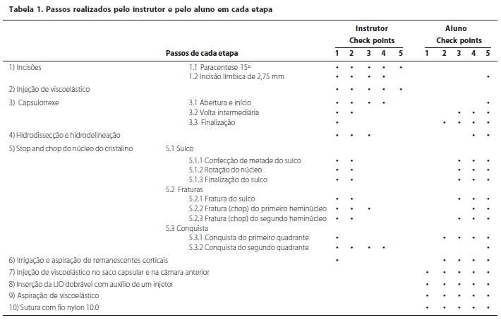 A cirurgia de catarata é o procedimento cirúrgico oftalmológico mais comumente realizado no Brasil, sendo a facoemulsificação a técnica mais utilizada devido a diversos fatores como possibilidade de microincisão tunelizada com aplicação de lente intraocular (LIO) dobrável (diminuindo astigmatismo induzido), menor tempo cirúrgico e dano corneoendotelial, possibilitando uma recuperação pós-operatória mais rápida(1-4). Portanto, um treinamento qualificado da técnica deve ser um dos principais objetivos de qualquer programa de residência de oftalmologia. Por ser uma cirurgia passo-dependente, foi adotado neste programa de ensino proposto pelo CBO, o método "reverso".