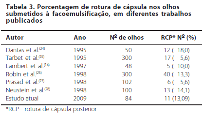 A tabela 3 mostra os resultados dos principais estudos que comparam a porcentagem de rotura de cápsula posterior nos olhos submetidos à facoemulsificação. Neste estudo, a porcentagem
