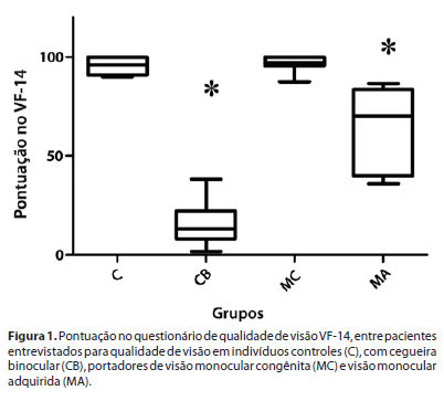 Objetivos: Quando a visão de um olho está preservada (visão monocular) e há alto risco, baixo prognóstico e/ou recursos limitados para a cirurgia do olho contralateral, não é claro se o beneficio da binocularidade supera o da reorientação para visão monocular. O objetivo é quantificar o impacto da qualidade de visão referida entre a condição binocular e monocular e, nesse último caso, entre congênita e adquirida. Métodos: Pacientes com acuidade visual (AV) com AV>0,5 em cada olho foram submetidos ao questionário estruturado de 14 perguntas (VF-14), onde a pontuação de 0 a 100 indica o nível de satisfação do paciente com sua visão, variando de baixo a alto respectivamente. Dados epidemiológicos e pontuações dos quatro grupos foram registrados e submetidos à análise estatística. Resultados: A entrevista pelo VF-14 com 56 indivíduos revelou que a pontuação mais alta foi similar entre os controles e os portadores de visão monocular congênita, e níveis intermediários e baixos foram obtidos por indivíduos com visão monocular adquirida e cegos bilaterais, respectivamente (p<0,001). As atividades mais difíceis para os indivíduos com visão monocular adquirida foram identificar letras pequenas, reconhecer pessoas, distinguir sinais de trânsito e assistir TV. Conclusão: O estudo confirmou que a perda da visão tem impacto desfavorável no desempenho referido das atividades sendo maior na visão monocular adquirida do que na congênita. Os dados sugerem que medidas de reabilitação devem ser consideradas para melhorar a qualidade da visão em doenças intratáveis ou de alto risco ou de baixo prognóstico.
