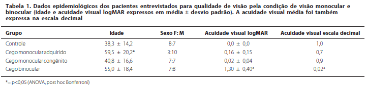 Os pacientes dos diferentes grupos tiveram distribuição etária e por sexos registrados, sendo o grupo de cegueira monocular adquirida mais velho e com predominância masculina (Tabela 1). A acuidade visual média foi similar entre controles e os dois grupos de cego monocular, e obviamente inferior no grupo de cegos binoculares (p<0,01, ANOVA e teste post hoc Bonferroni) (Tabela 1).