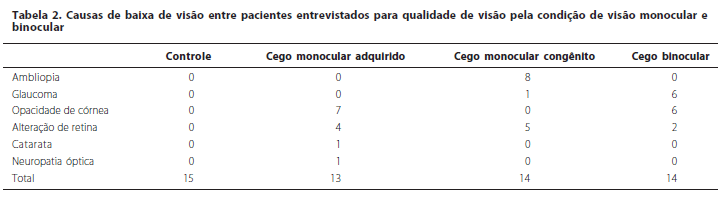 Pelas razões apresentadas, o objetivo desse estudo foi avaliar o impacto da visão monocular na qualidade de visão referida por pessoas com cegueira monocular, congênita e adquirida, no desempenho de suas atividades diárias, comparado a pacientes com visão normal e cegos binoculares, usando o questionário "Visual Function-14" (VF-14)(18).