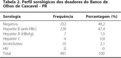 A causa de óbito foi definida como principal causa de morte pelo atestado de óbito. Tempo entre óbito e enucleação foi calculado em horas. No momento da captação foi realizada a coleta de amostra de sangue para a realização de exames sorológicos obrigatórios. As amostras de sangue do doador foram enviadas a um laboratório terceirizado que enviava os resultados por via eletrônica. No Banco de Olhos de Cascavel são realizados rotineiramente os testes sorológicos HBsAg, anti-HBc, anti-HCV, anti-HIV1 e anti-HIV2(5).
