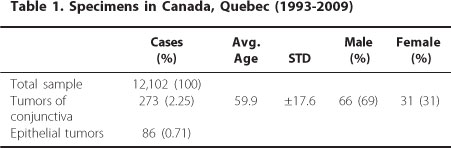 Incidence of epithelial lesions of the conjunctiva in a review of 12,102 specimens in Canada (Quebec)