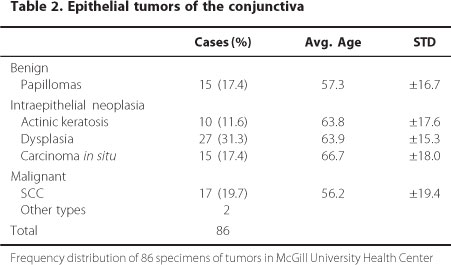CONCLUSIONS: The distribution of our sample is similar to the one reported by the American Forces Institute of Pathology (AFIP) in 1994. When we compare our sample to others coming from countries with high levels of sunlight exposure, we found a lower incidence of ocular surface squamous neoplasia, including squamous cell carcinomas in Canada.