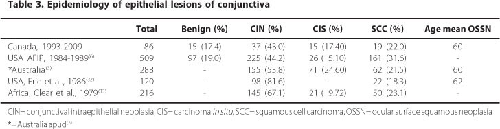 MÉTODOS: Trata-se de estudo retrospectivo de todos os casos recebidos durante 16 anos (1993-2009) no Henry C. Witelson Ocular Pathology Laboratory, em Montreal. Dados epidemiológicos foram obtidos por meio de requerimento e laudos histopatológicos, sendo classificados e analisados pelo porcentual na amostra. A relativa frequência de lesões epiteliais da conjuntiva foram obtidas em um único centro de análises no Canadá.