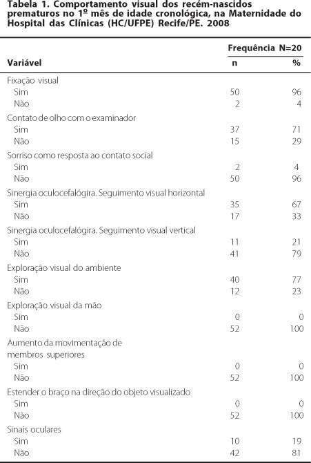 Com relação às funções oculomotoras de fixação visual, contato de olho com o examinador, seguimento visual horizontal e exploração visual do ambiente, os RNPT apresentaram respostas positivas para estes comportamentos desde o 1º mês de vida, assim como os RN a termo(13,24-25). A menor frequência de respostas positivas para o comportamento de sorriso, está em concordância com a literatura, que descreve maior frequência desta função a partir do 2º mês de vida(16,24-25).