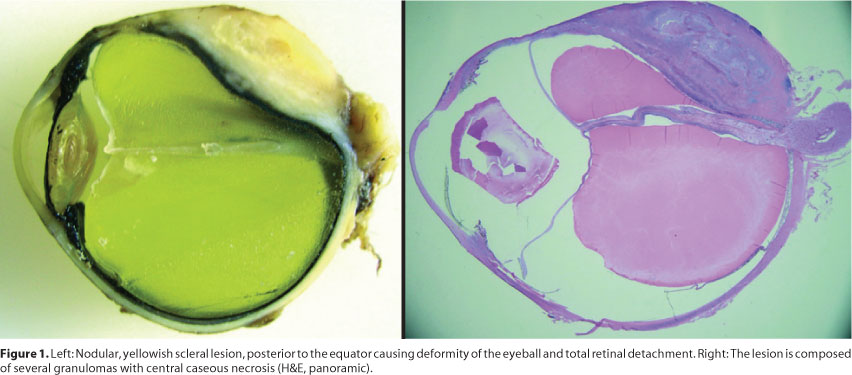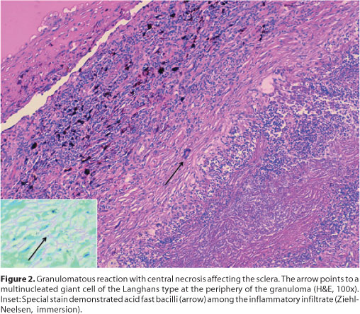 A 66-year-old woman presented with a 3-month history of vision loss in the right eye. The patient was diabetic and had rheumatoid arthritis which had been treated for 8 years with desflazacort (5 mg/day); naproxeno (500 mg/day) and leflunomide (20 mg/day). Purified protein derivative (PPD) test was negative and chest radiograph was normal. The visual acuity was no light perception in OD and 20/30 in OS. Examination of the left eye was unremarkable. In OD there was a dense cataract with 360º posterior synechiae which precluded fundus view. B-scan ultrasonography demonstrated a total retinal detachment overlying a posterior intraocular mass. Topographic and magnetic resonance images revealed that the intraocular mass had no orbital extension. As the findings were compatible with coroidal melanoma, enucleation was advised. After surgery, macroscopic examination disclosed a large (20 x 6 mm) justapapilary scleral nodule (Figure 1). Microscopic examination revealed a granuloma with caseation limited to the sclera. Acid-fast bacilli were found in sections with Ziel-Nielsen staining (Figure 2). A systemic work-up did not show any evidence of tuberculosis elsewhere.