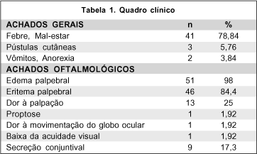 Ao analisar o quadro clínico, observou-se predomínio dos seguintes sinais e sintomas: edema palpebral (98%) e eritema palpebral (88,4%), febre e mal-estar (78,84%) e dor à palpação (25%), fato também observado por Dudin e Othman(6). Não houve casos de redução da motilidade ocular, defeito pupilar aferente ou diplopia; devido, provavelmente, ao fato da localização pré-septal corresponder a 94,2% dos casos estudados.