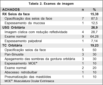 Os exames de imagem, representados pela radiografia dos seios da face, ultra-sonografia orbitária e tomografia computadorizada orbitária, foram realizados em 29 pacientes (55,7%) (Tabela 2).