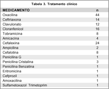 Foram utilizados 25 diferentes esquemas terapêuticos, correspondendo a 16 medicamentos isolados ou em combinação, por um período de tempo que variou de 3 a 21 dias (média de 13 dias); sendo que os mais freqüentes foram Oxacilina e Ceftriaxona com Ácido Clavulânico pós-alta hospitalar (11,53%), Oxacilina e Cloranfenicol (11,53%) e Oxacilina e Ceftriaxona seguidos por Cefalexina pós-alta hospitalar (9,61%). Os antibióticos mais utilizados isoladamente ou combinados foram: Oxacilina, Cefalexina, Cloranfenicol e Ceftriaxona. (Tabela 3) Existiram 6 pacientes tratados com monoterapia, utilizando: Cefalotina ou Cefalexina em 3 pacientes (50%) e Oxacilina em 2 pacientes (33,3%) e Ácido Clavulânico em 1 paciente (16,7%). A terapia combinada com duas medicações foi utilizada por 12 pacientes; os esquemas mais comuns foram: Oxacilina e Cloranfenicol em 4 casos (33,3%) e Oxacilina e Cefalexina também em 4 casos (33,3%). Os demais pacientes, representados por 34 crianças, foram tratados com três ou mais medicações.