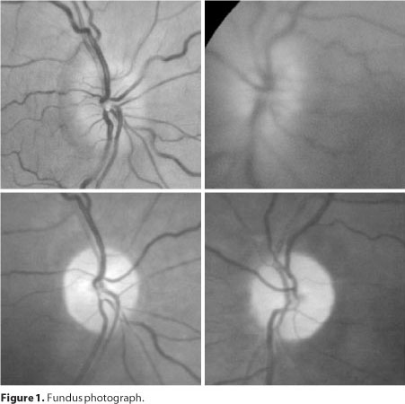 Fundoscopic examination in previously reported cases and the patient presented in this paper demonstrate diffuse optic disc edema with or without hemorrhages on the disc margin and the presence of a small cup-to-disc ratio. Automated perimetry in previously reported cases revealed: a superior altitudinal visual field defect, dense superior and inferior arcuate defects and an inferior altitudinal defect(9-11). Most of these clinical characteristics are similar to those found in cases with typical NAION, not related to glaucoma although in the latter the disc edema tends to be segmental and the altitudinal field defect generally occurs inferiorly. The presence of optic disc with small or absent physiologic cup is a frequent finding in both in typical NAION and in cases secondary to acute glaucoma(6-7) . Therefore, although we can find some differences and similarities in clinical findings of patients with NAION after acute rise of IOP and patients with typical idiopathic NAION, the number of cases of NAION after acute glaucoma is so small that one a clear distinction between the two modalities of ischemic optic neuropathies cannot be established.