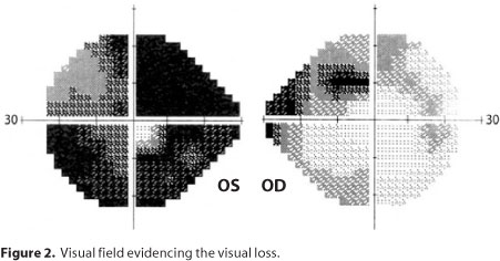 A 55-year-old woman was referred to our clinic because of a one-week history of visual loss and raised intraocular pressure in the left eye (OS) followed 4 days later by visual loss in the right eye (OD). Glaucoma medication had been prescribed elsewhere without clinical improvement. Past medical history was completely unremarkable. On examination, visual acuity was hand movements in OD and light perception in OS. Slit-lamp examination showed bilateral conjunctival hyperemia, slight diffuse corneal edema, shallow anterior chamber and fixed and dilated pupil in both eyes. Splitting of the anterior layers of the iris with fibrillar degeneration extending for approximately one quadrant inferiorly was present in each eye. The clinical appearance was consistent with iridoschisis. Intraocular pressure was 42 mmHg in OD and 44 mmHg in OS. Gonioscopy revealed that the patient had narrow angles (Shaffer grade 0) for 360º in OU. Ultrasound biometry revealed axial lengths on A-scan of 20.42 mm in OD and 20.09 mm in OS. Fundus examination showed opitc disc edema with no vascular tortuosity and no cup in OU. Medical treatment with timolol, brimonidine, pilocarpine, prednisolone eye drops, manitol and acetazolamide, followed by YAG laser iridectomy achieved satisfactory IOP control. Two months later the best corrected visual acuity was 20/20 in OD and 20/200 in OS. Intraocular pressure was 11 mmHg OU with no medication and patent iridectomies. Optic disc edema progressively resolved and was followed by optic disc pallor in OU (Figure 1). Visual perimetry revealed a significant visual field defect especially in OS (Figure 2).