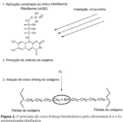 Usando UVA em um comprimento de onda de 370 nm e o fotossintetizador riboflavina (Figuras 1 e 2), esta é excitada em seu estado triplo produzindo espécies reativas de oxigênio, principalmente oxigênio livre e em menor quantidade radicais de ânion superóxidos. O oxigênio livre reage com várias moléculas induzindo ligações químicas covalentes e pontes entre grupos aminos das fibrilas de colágeno corneano (reação fotoquímica tipo II). O comprimento de onda de 370 nm foi escolhido porque é onde se dá o pico de absorção da riboflavina(5) . A riboflavina, vitamina B2 (peso molecular de 376,37 g/mol(6)), é um fotossintetizador não tóxico, solúvel em água e penetra facilmente no estroma corneano na ausência de epitélio(3).