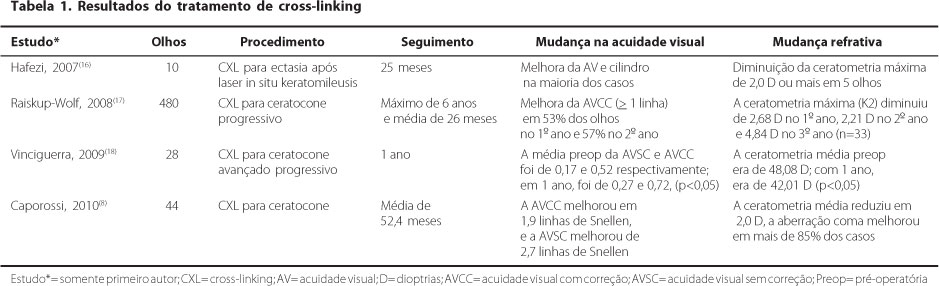 A tabela 1 mostra alguns resultados recentes da literatura no tratamento de cross-linking para ceratocone e outras ectasias.
