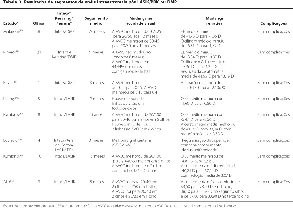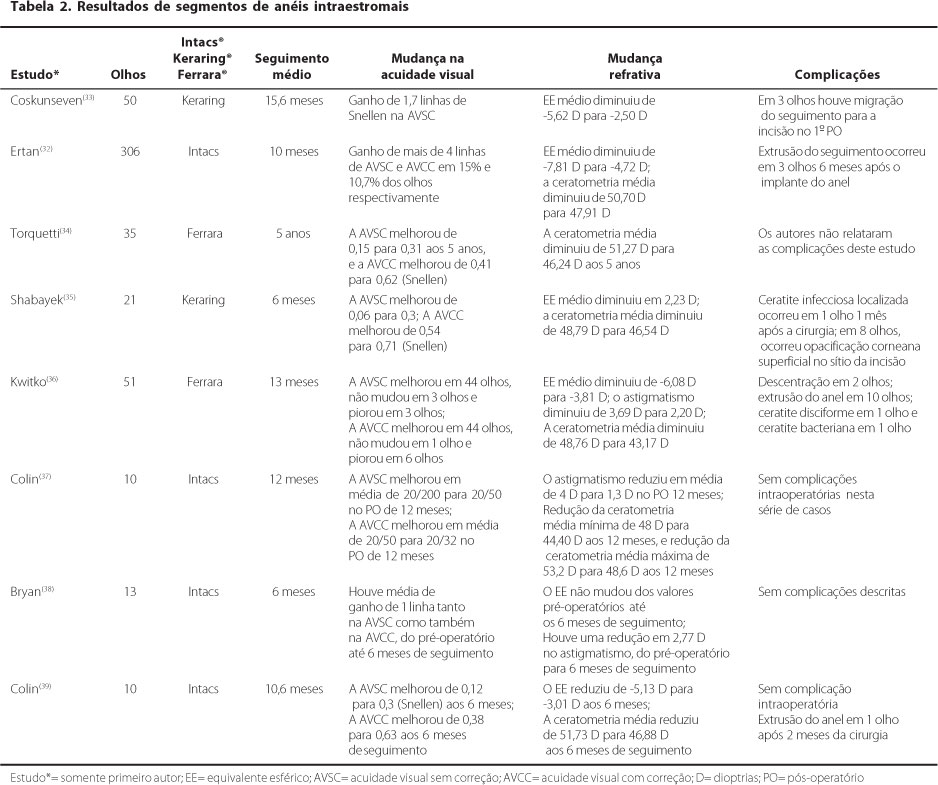 A tabela 2 mostra alguns resultados da literatura em relação à inserção de diferentes tipos de anéis em ceratocone, assim como as duas diferentes técnicas.