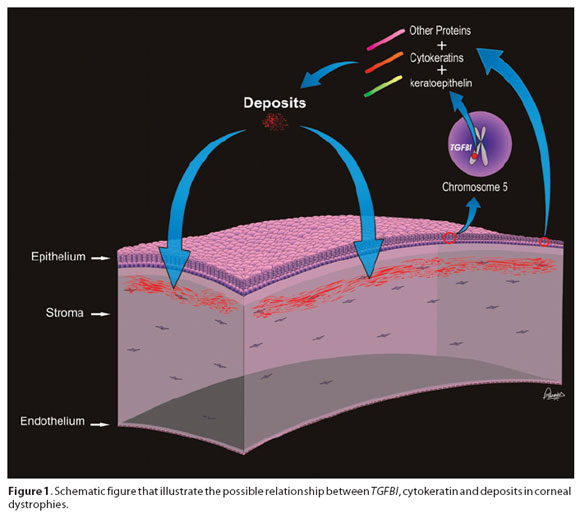 The transforming growth factor beta induced gene (TGFBI) on chromosome 5, responsible for the quality and quantity of keratoepithelin, has been related to several corneal dystrophies. The immunoreactivity of the keratoepithelin protein has been demonstrated in the dystrophic deposits of corneas with granular, Avellino, Reis-Buckler, lattice and Thiel-Behnke dystrophies, all related to the TGFBI gene suggesting that keratoepithelin is a major component of these deposits(1,7).