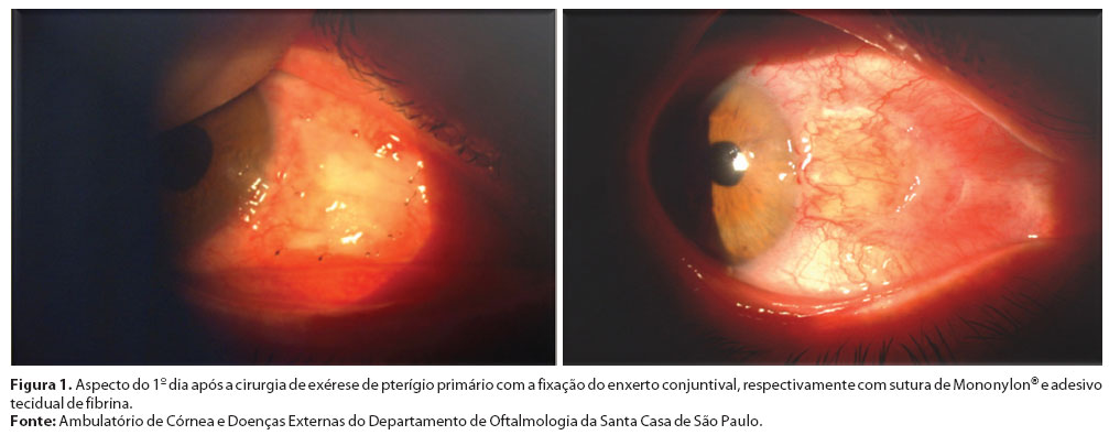 O objetivo deste estudo foi comparar a eficácia da fixação do enxerto de conjuntiva ao leito escleral utilizando-se adesivo tecidual de fibrina com a sutura de Mononylon® após exérese de pterígio primário.