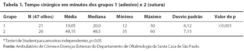 O tempo médio de cirurgia foi de 19,05 ± 6,12 minutos no grupo 1 (adesivo) e 48,5 ± 7,13 minutos no grupo 2 (sutura) com p<0,001 (Tabela 1).